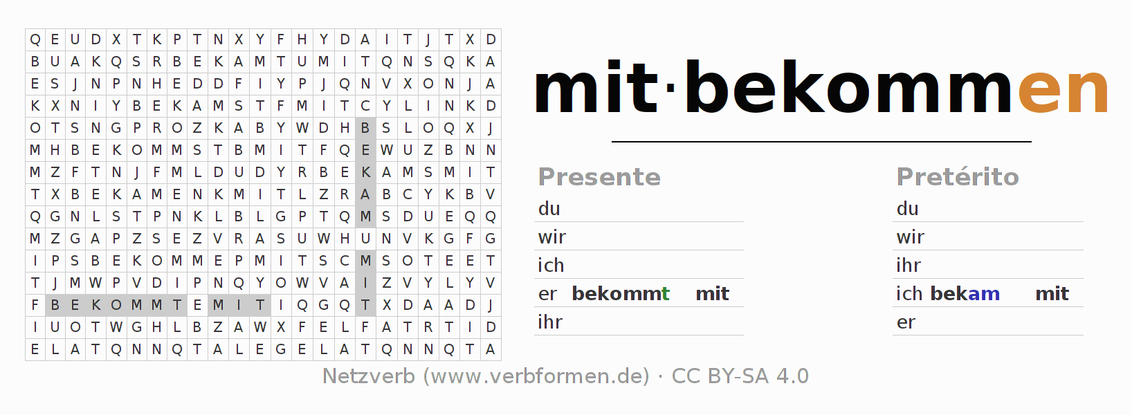 Solução do caça-palavras para a conjugação do verbo mitbekommen