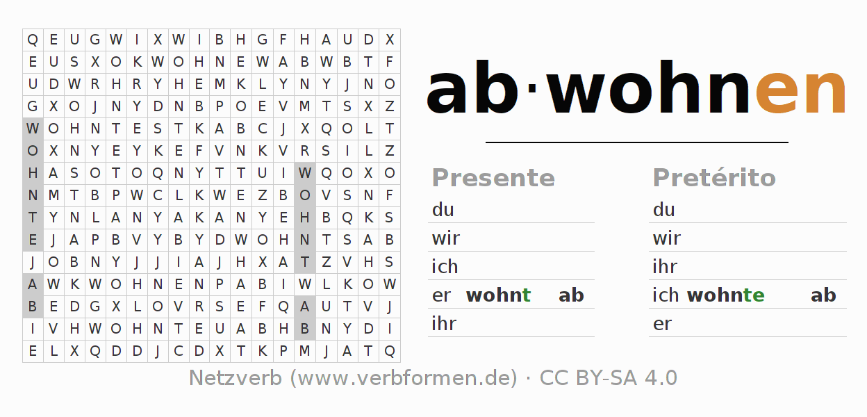 Solução do caça-palavras para a conjugação do verbo abwohnen
