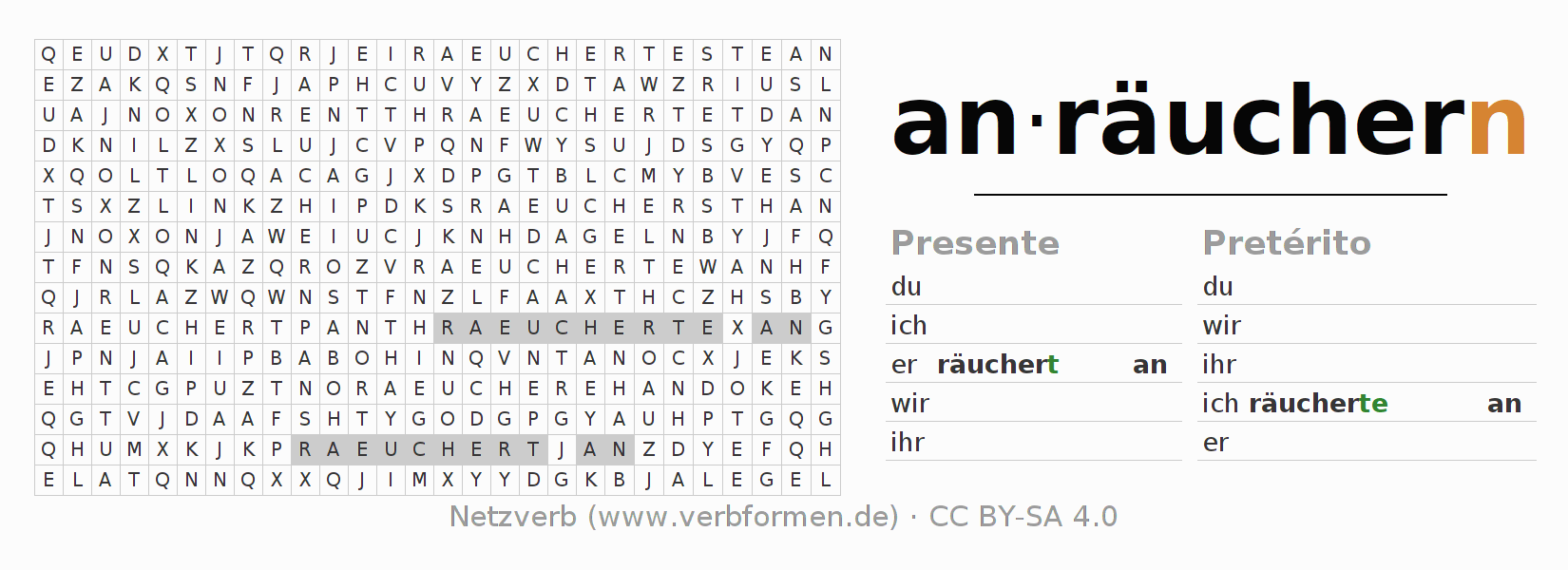 Instruções: reconhecer as formas verbais do verbo anräuchern e encontrá-las no caça-palavras. Ou reconhecer a forma flexionada do verbo anräuchern e atribuir a forma verbal correta. Trema e ß estão escritos como oe, ae, ue e ss.A solução encontra-se no final da página.