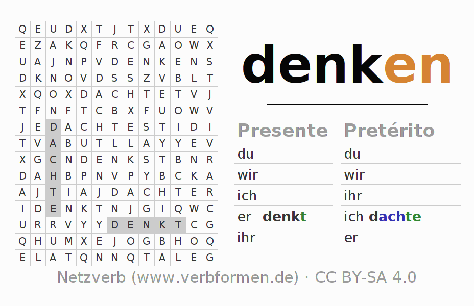Solução do caça-palavras para a conjugação do verbo denken