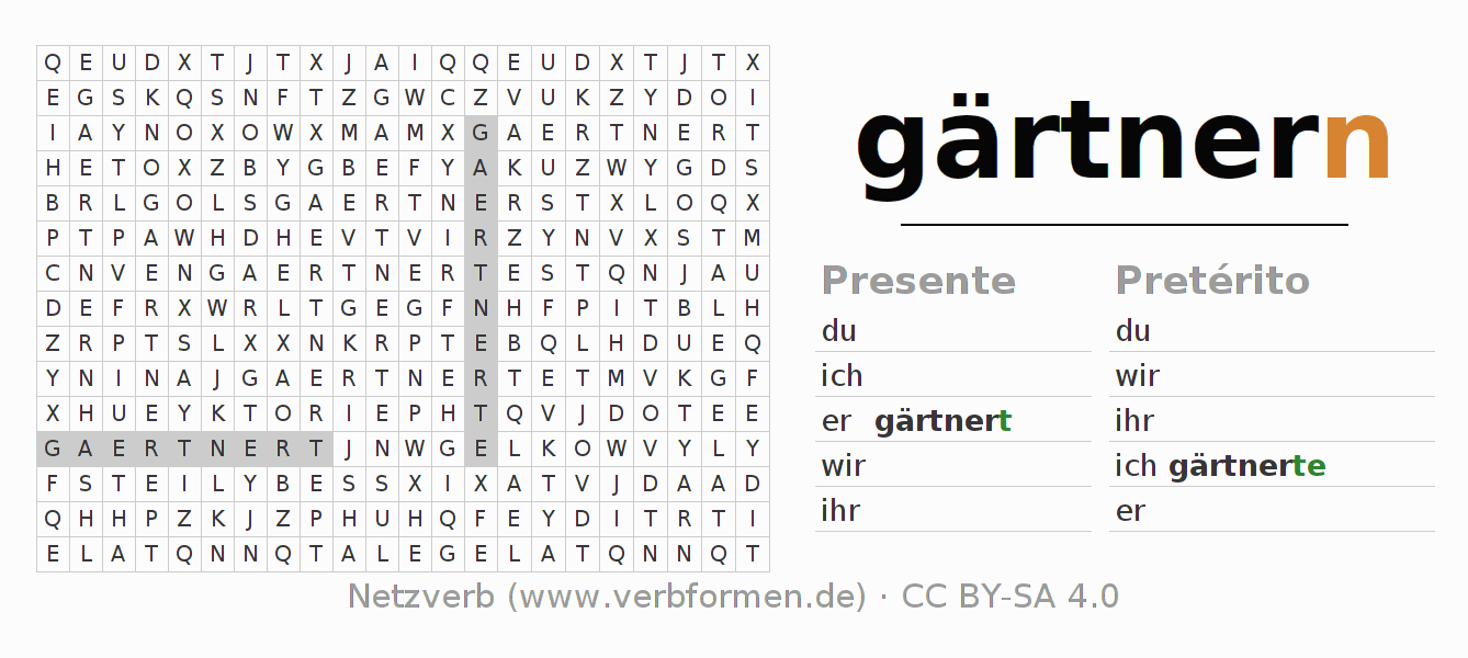 Solução do caça-palavras para a conjugação do verbo gärtnern