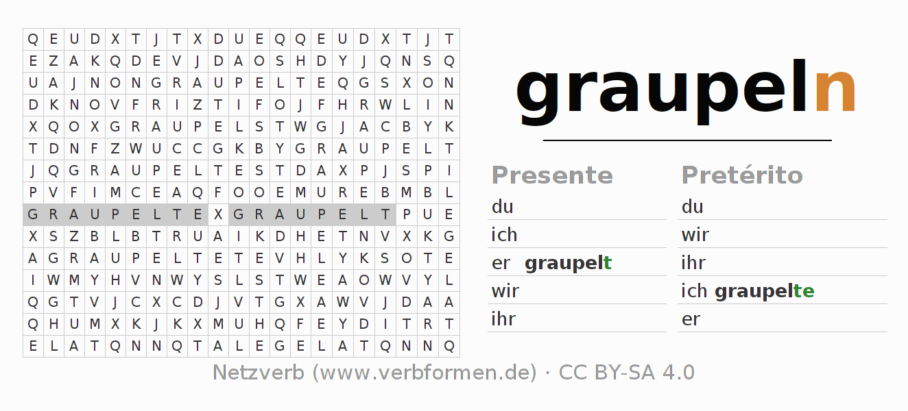 Instruções: reconhecer as formas verbais do verbo graupeln e encontrá-las no caça-palavras. Ou reconhecer a forma flexionada do verbo graupeln e atribuir a forma verbal correta. Trema e ß estão escritos como oe, ae, ue e ss.A solução encontra-se no final da página.