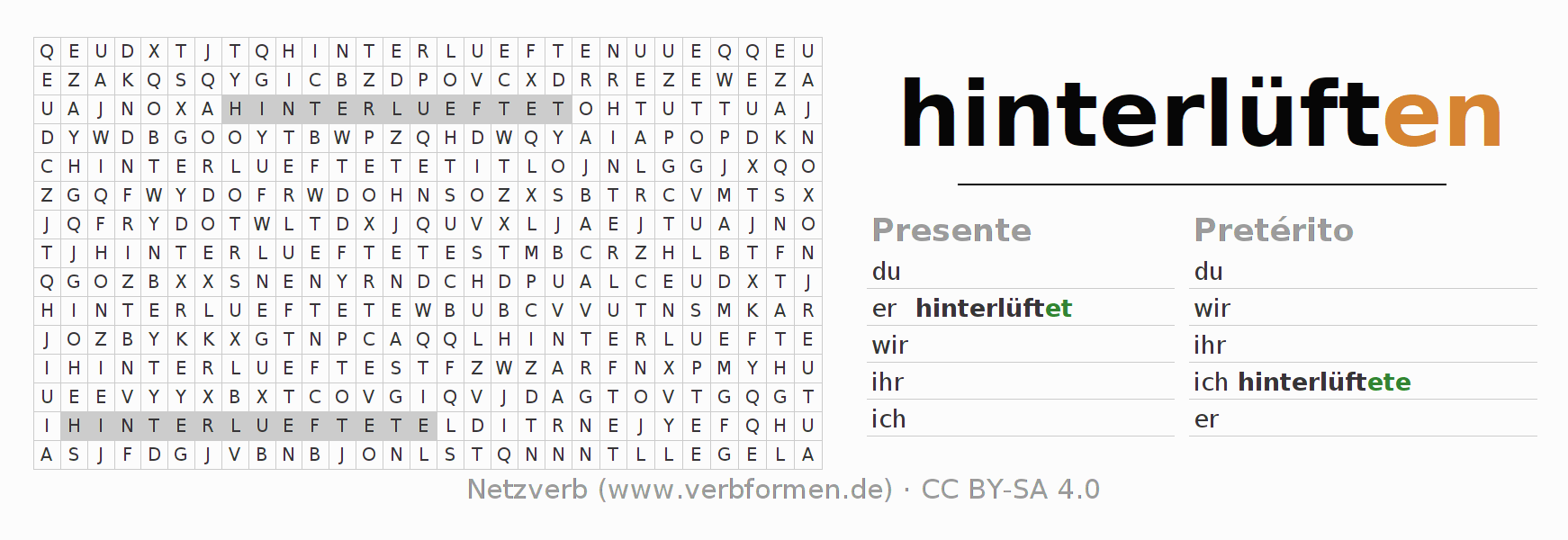 Instruções: reconhecer as formas verbais do verbo hinterlüften e encontrá-las no caça-palavras. Ou reconhecer a forma flexionada do verbo hinterlüften e atribuir a forma verbal correta. Trema e ß estão escritos como oe, ae, ue e ss.A solução encontra-se no final da página.