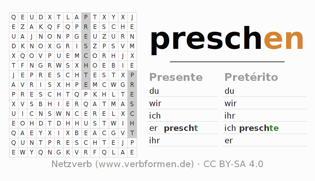 Instruções: reconhecer as formas verbais do verbo preschen e encontrá-las no caça-palavras. Ou reconhecer a forma flexionada do verbo preschen e atribuir a forma verbal correta. Trema e ß estão escritos como oe, ae, ue e ss.A solução encontra-se no final da página.