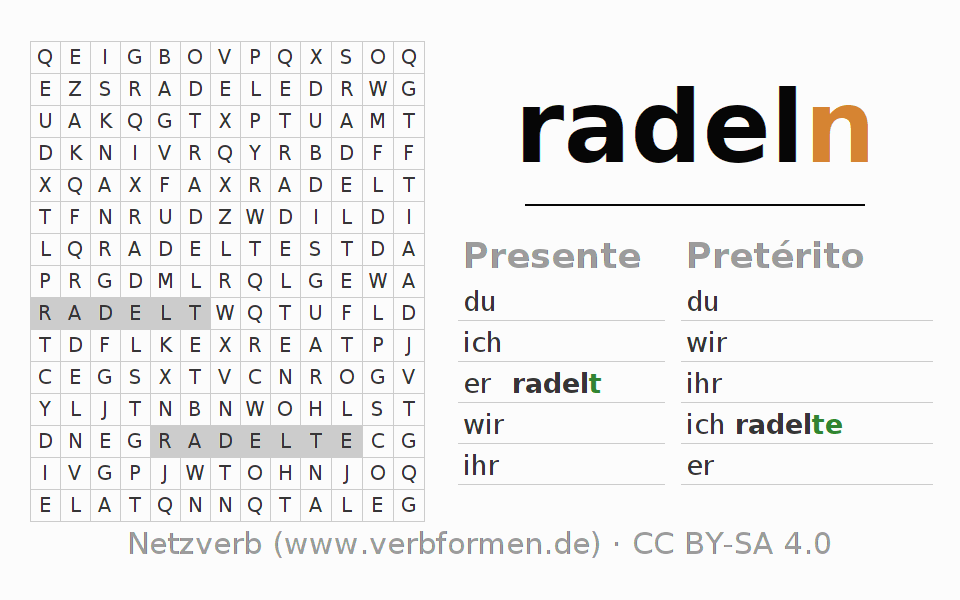 Solução do caça-palavras para a conjugação do verbo radeln