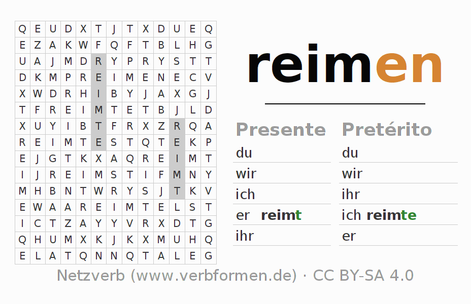 Instruções: reconhecer as formas verbais do verbo reimen e encontrá-las no caça-palavras. Ou reconhecer a forma flexionada do verbo reimen e atribuir a forma verbal correta. Trema e ß estão escritos como oe, ae, ue e ss.A solução encontra-se no final da página.