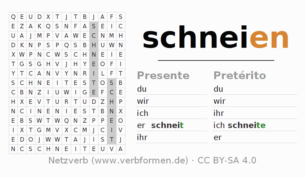 Caça-palavras da conjugação do verbo em alemão schneien (hat)