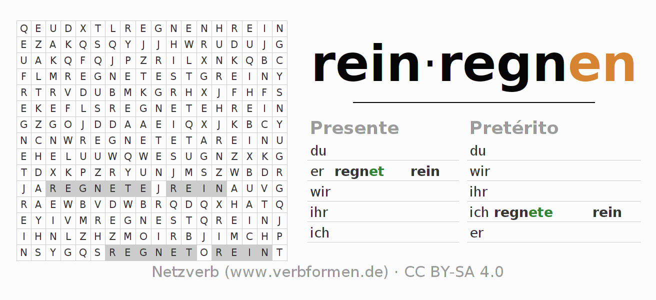 Instruções: reconhecer as formas verbais do verbo reinregnen e encontrá-las no caça-palavras. Ou reconhecer a forma flexionada do verbo reinregnen e atribuir a forma verbal correta. Trema e ß estão escritos como oe, ae, ue e ss.A solução encontra-se no final da página.