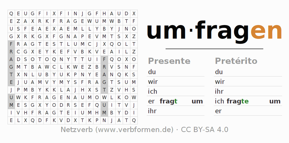 Solução do caça-palavras para a conjugação do verbo umfragen