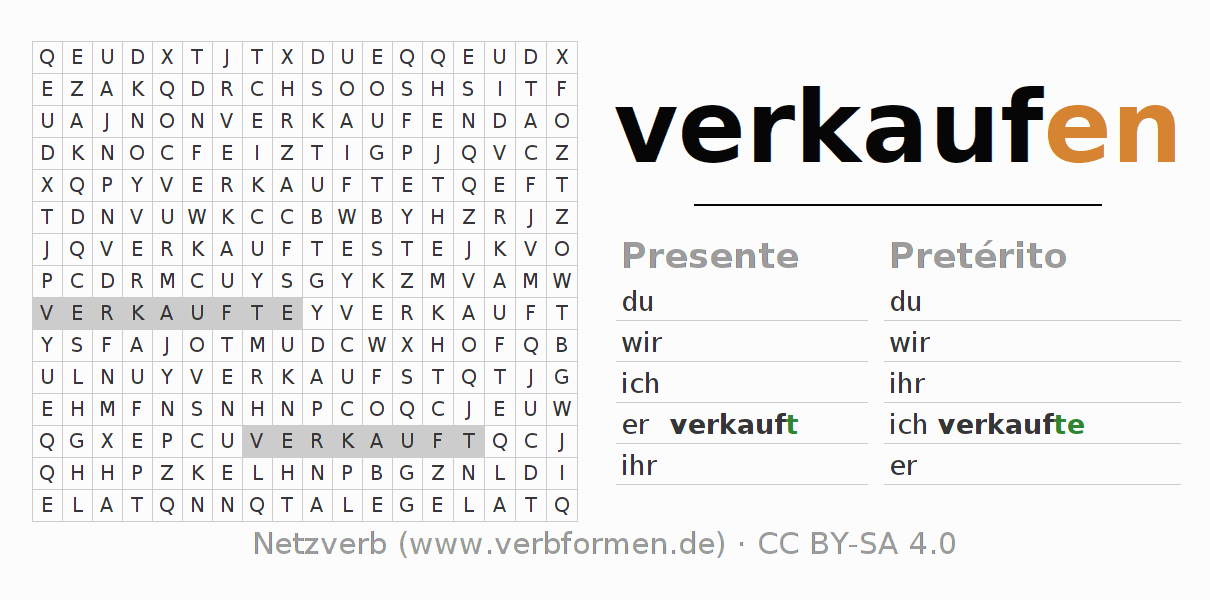 Solução do caça-palavras para a conjugação do verbo verkaufen