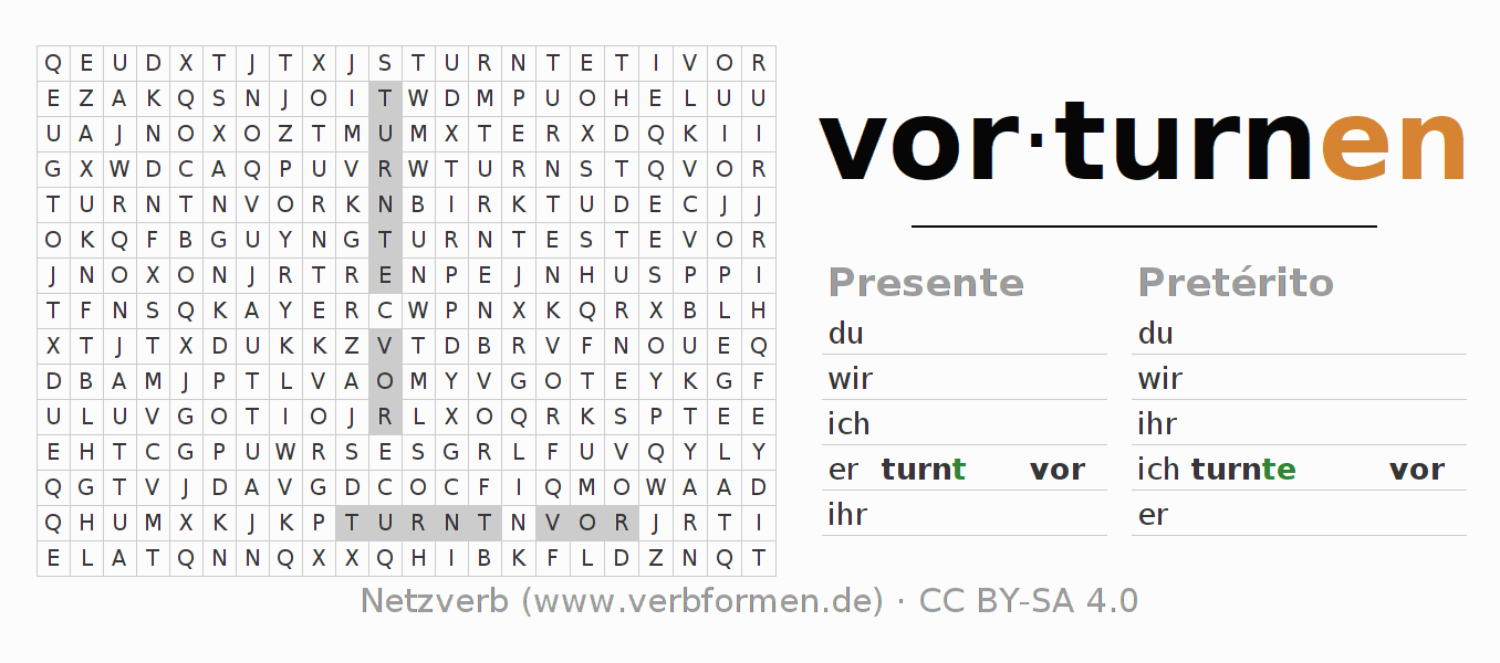 Solução do caça-palavras para a conjugação do verbo vorturnen