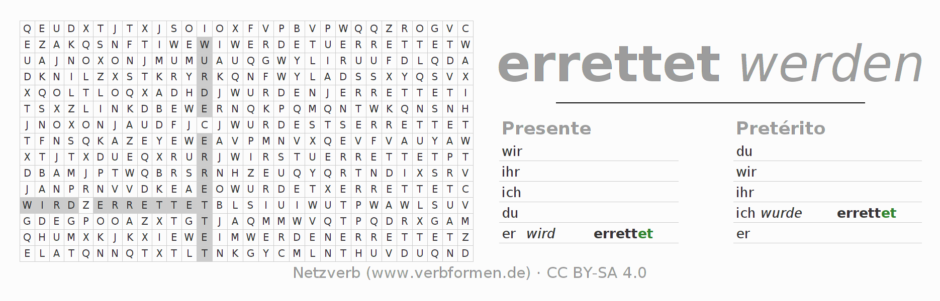 Caça-palavras com a conjugação do verbo erretten 〈Voz Passiva〉