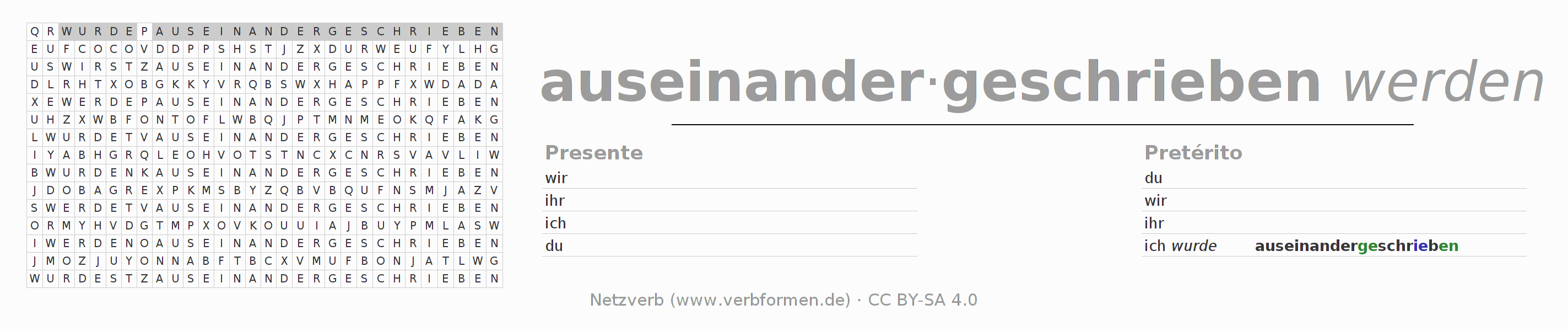 Solução do caça-palavras para a conjugação do verbo auseinanderschreiben