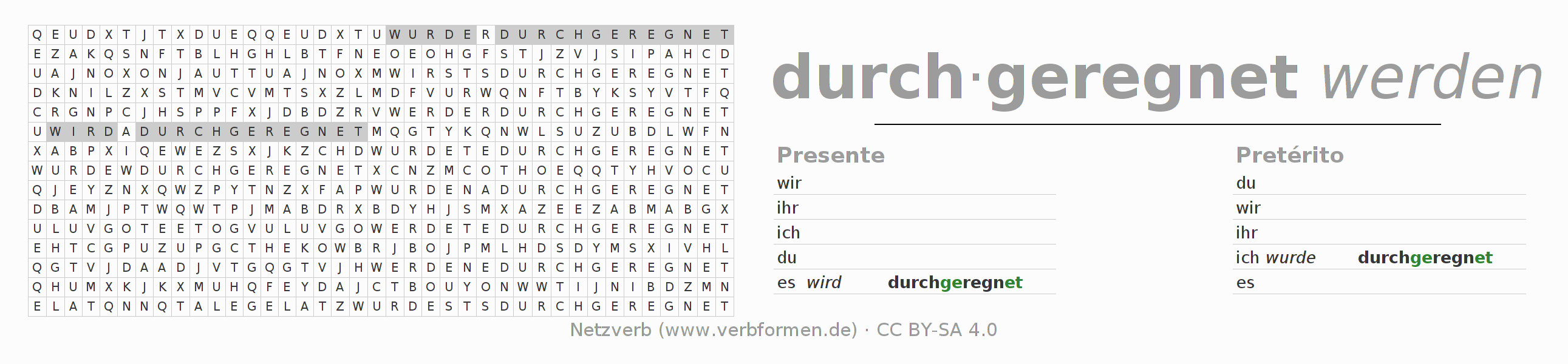 Solução do caça-palavras para a conjugação do verbo durchregnen