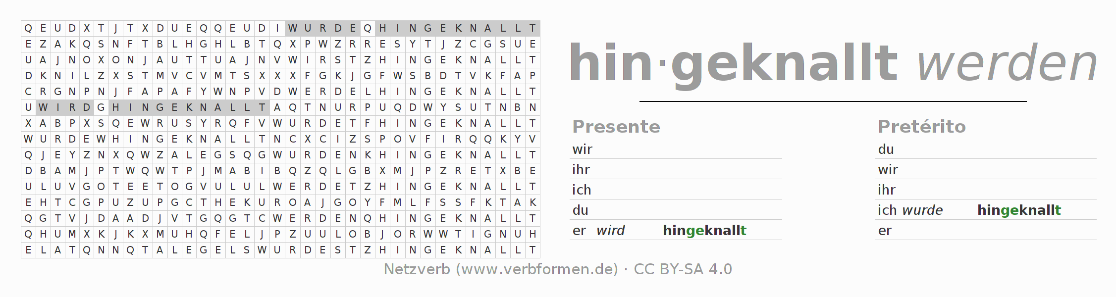 Instruções: reconhecer as formas verbais do verbo hinknallen e encontrá-las no caça-palavras. Ou reconhecer a forma flexionada do verbo hinknallen e atribuir a forma verbal correta. Trema e ß estão escritos como oe, ae, ue e ss.A solução encontra-se no final da página.