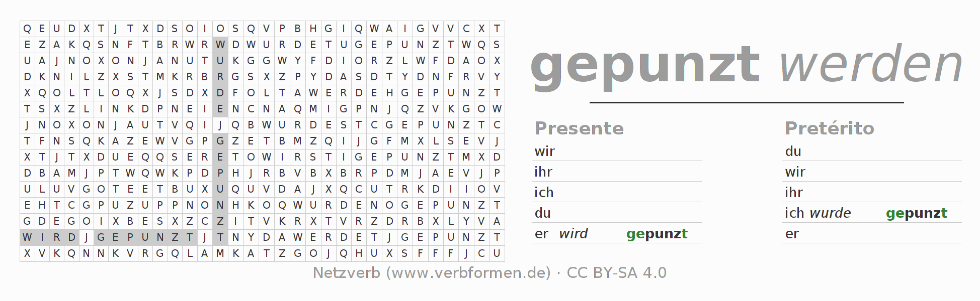 Instruções: reconhecer as formas verbais do verbo punzen e encontrá-las no caça-palavras. Ou reconhecer a forma flexionada do verbo punzen e atribuir a forma verbal correta. Trema e ß estão escritos como oe, ae, ue e ss.A solução encontra-se no final da página.