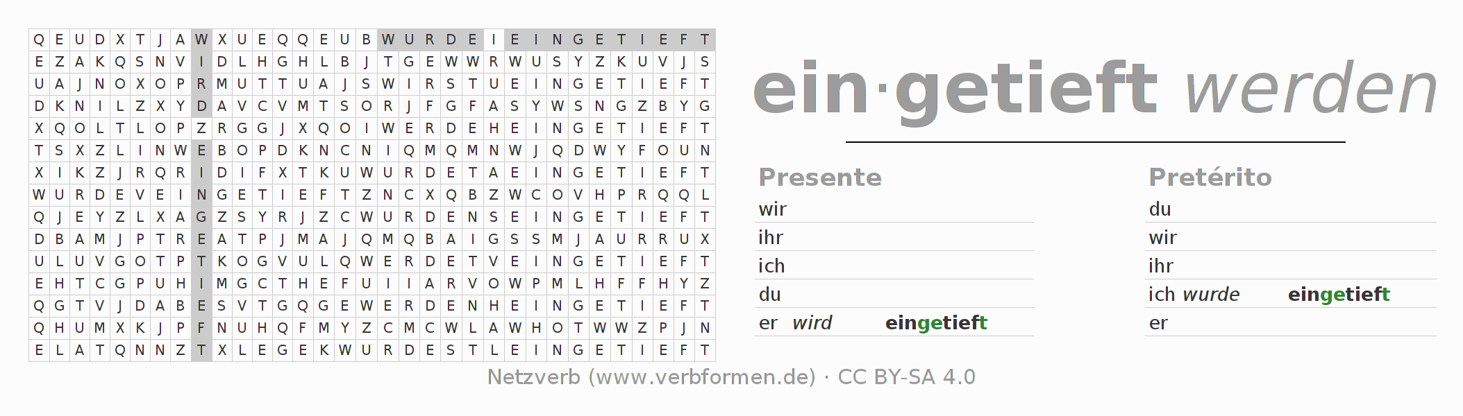 Solução do caça-palavras para a conjugação do verbo eintiefen