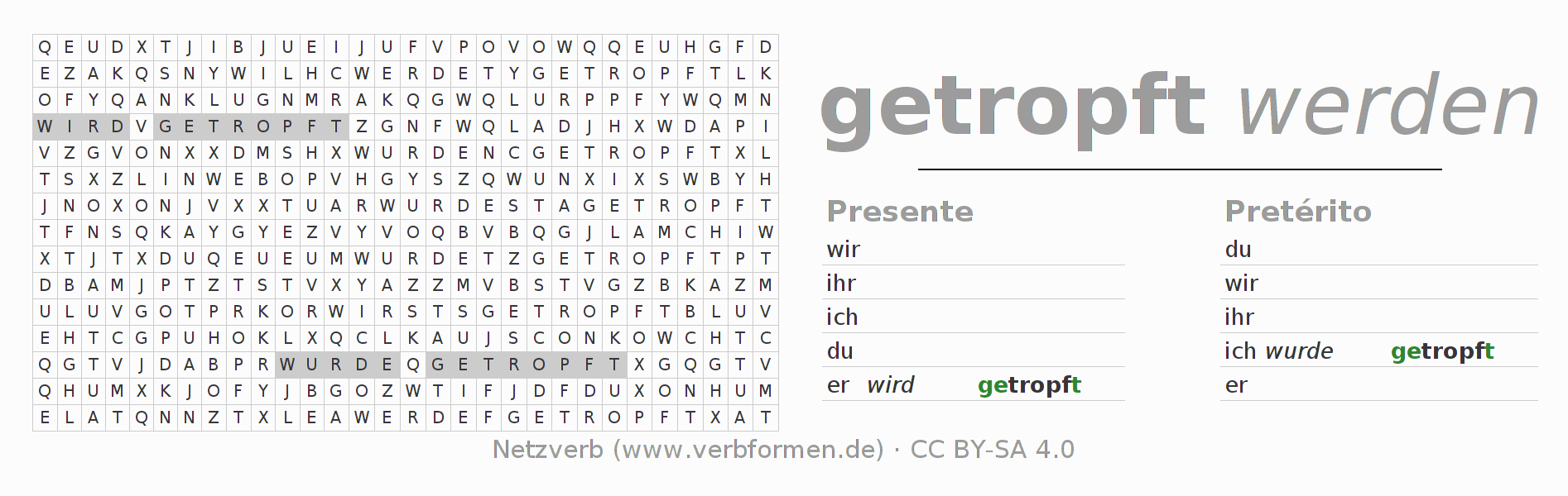 Solução do caça-palavras para a conjugação do verbo tropfen (hat)