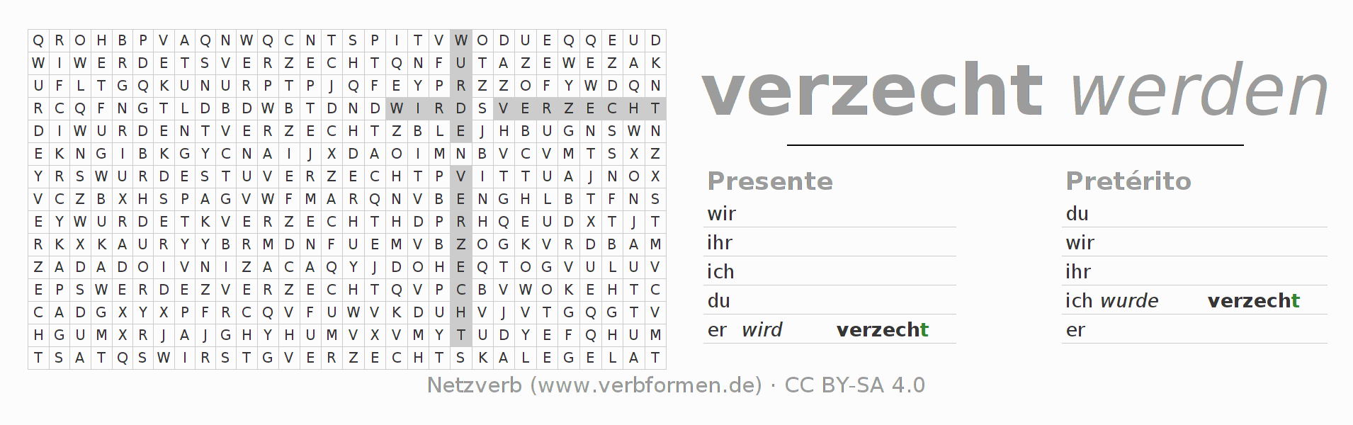 Solução do caça-palavras para a conjugação do verbo verzechen