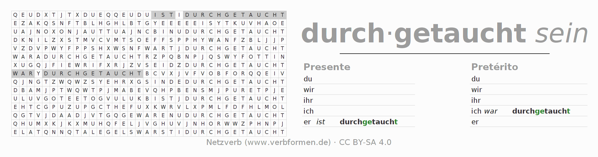 Solução do caça-palavras para a conjugação do verbo durchtauchen