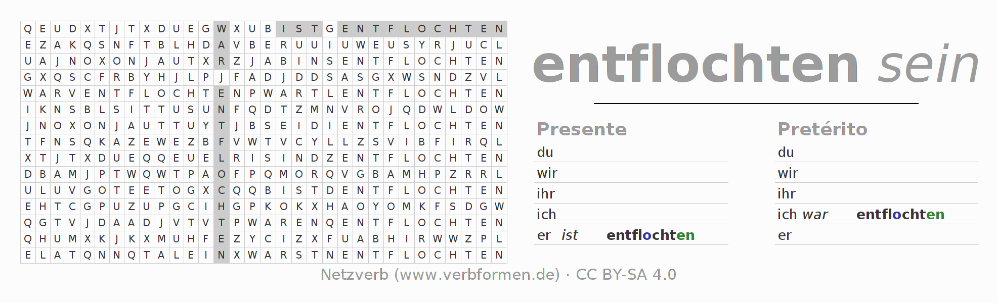 Instruções: reconhecer as formas verbais do verbo entflechten e encontrá-las no caça-palavras. Ou reconhecer a forma flexionada do verbo entflechten e atribuir a forma verbal correta. Trema e ß estão escritos como oe, ae, ue e ss.A solução encontra-se no final da página.