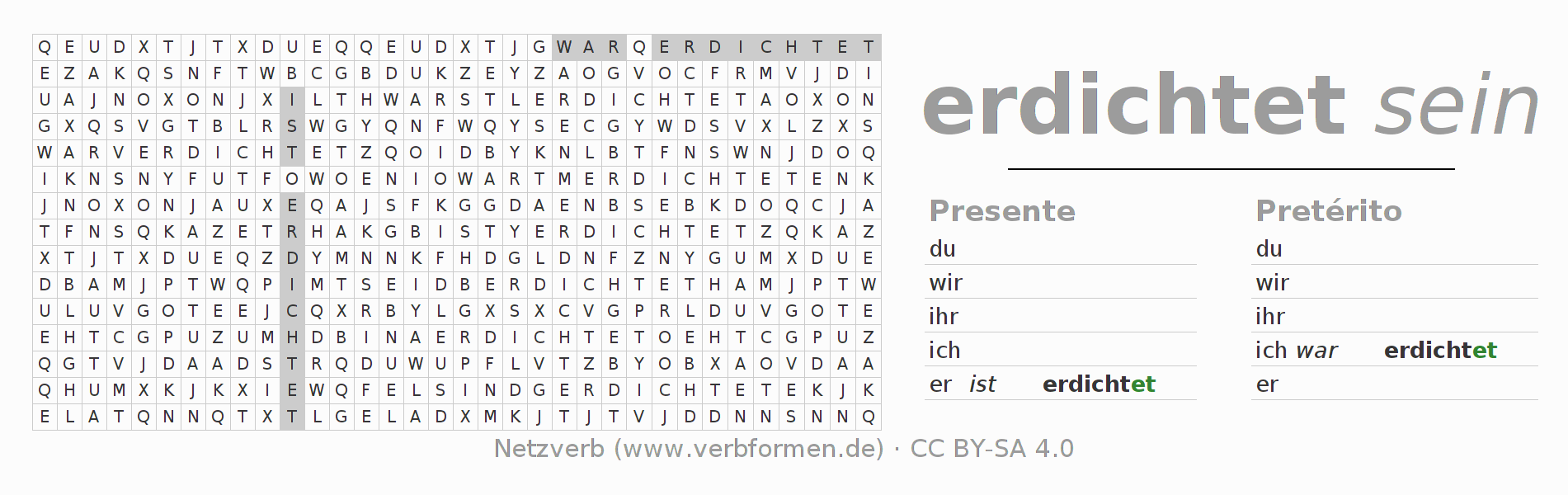 Caça-palavras com a conjugação do verbo erdichten 〈Estado passivo〉