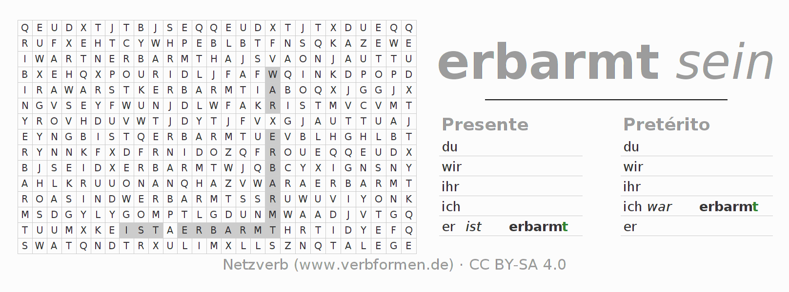 Solução do caça-palavras para a conjugação do verbo erbarmen