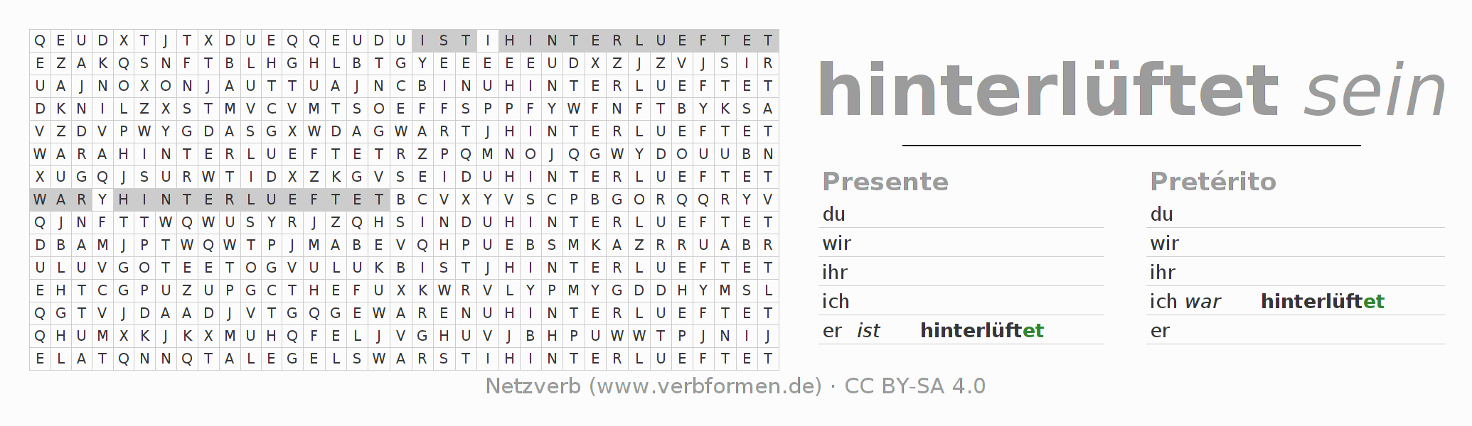 Instruções: reconhecer as formas verbais do verbo hinterlüften e encontrá-las no caça-palavras. Ou reconhecer a forma flexionada do verbo hinterlüften e atribuir a forma verbal correta. Trema e ß estão escritos como oe, ae, ue e ss.A solução encontra-se no final da página.