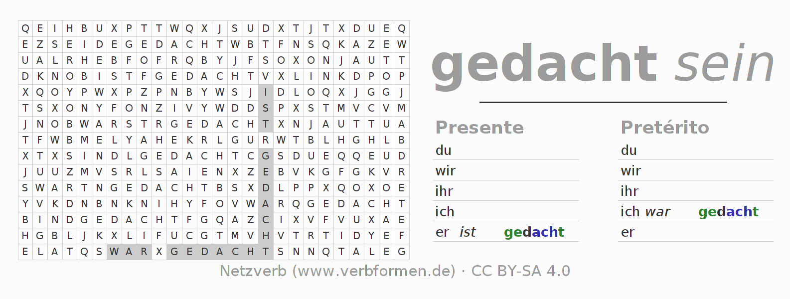 Instruções: reconhecer as formas verbais do verbo denken e encontrá-las no caça-palavras. Ou reconhecer a forma flexionada do verbo denken e atribuir a forma verbal correta. Trema e ß estão escritos como oe, ae, ue e ss.A solução encontra-se no final da página.