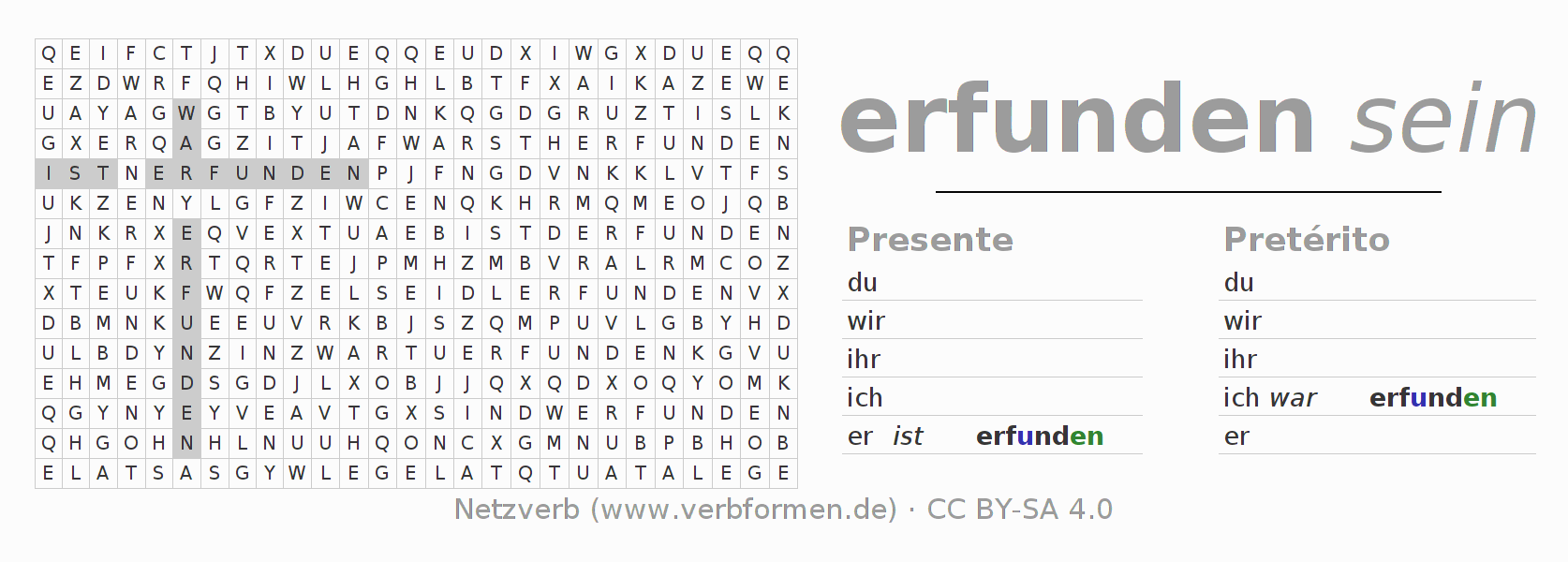 Solução do caça-palavras para a conjugação do verbo erfinden
