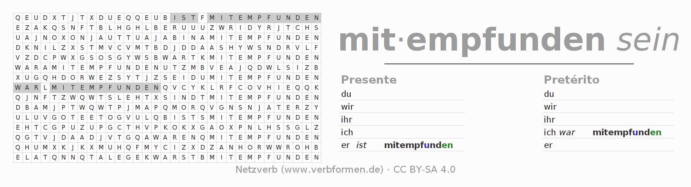Solução do caça-palavras para a conjugação do verbo mitempfinden
