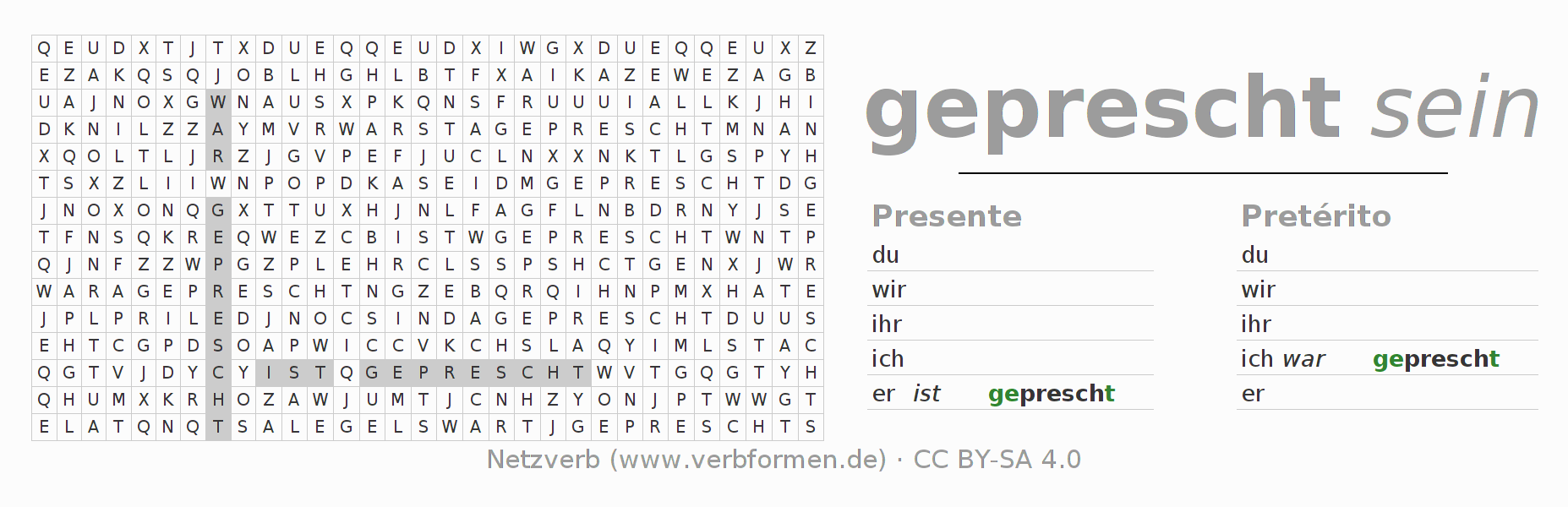 Caça-palavras com a conjugação do verbo preschen 〈Estado passivo〉