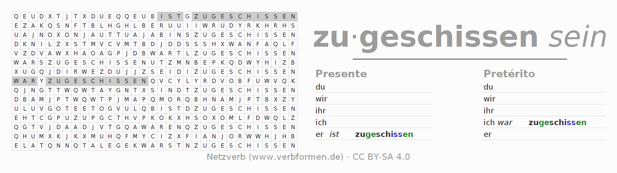 Instruções: reconhecer as formas verbais do verbo zuscheißen e encontrá-las no caça-palavras. Ou reconhecer a forma flexionada do verbo zuscheißen e atribuir a forma verbal correta. Trema e ß estão escritos como oe, ae, ue e ss.A solução encontra-se no final da página.