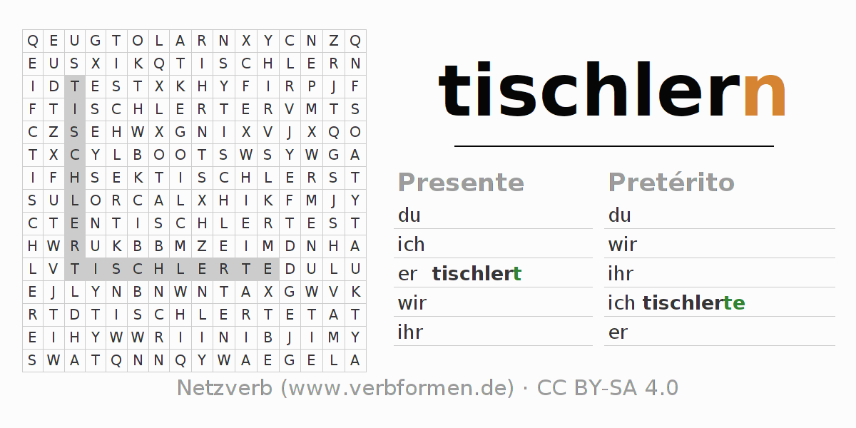 Com o caça-palavras aprende-se de uma forma desafiadora a conjugação do verbo tischlern.