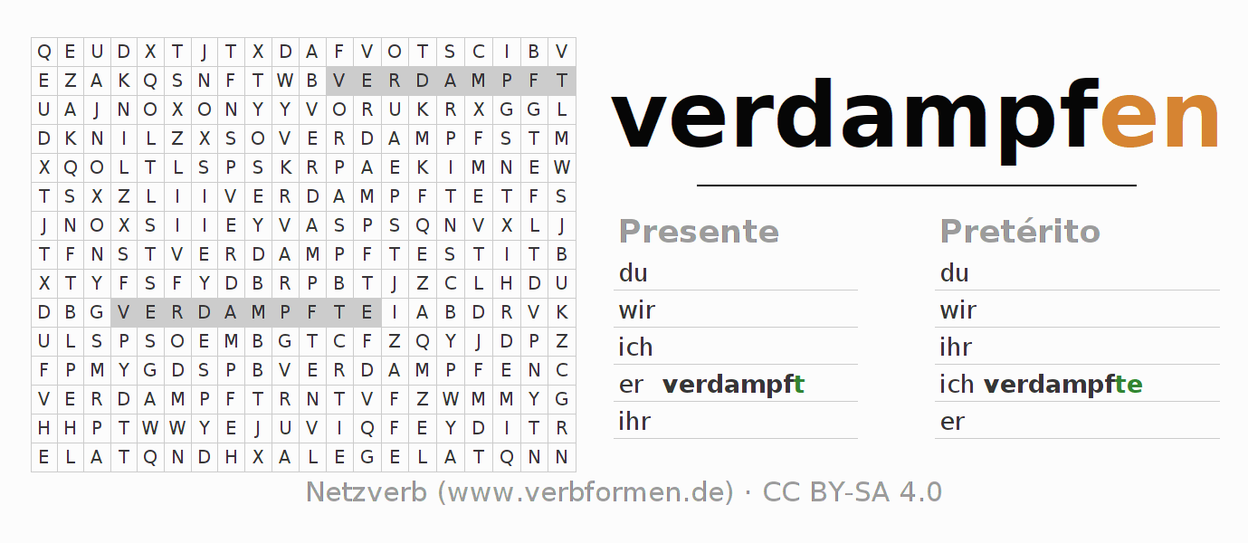 Com o caça-palavras aprende-se de uma forma desafiadora a conjugação do verbo verdampfen.