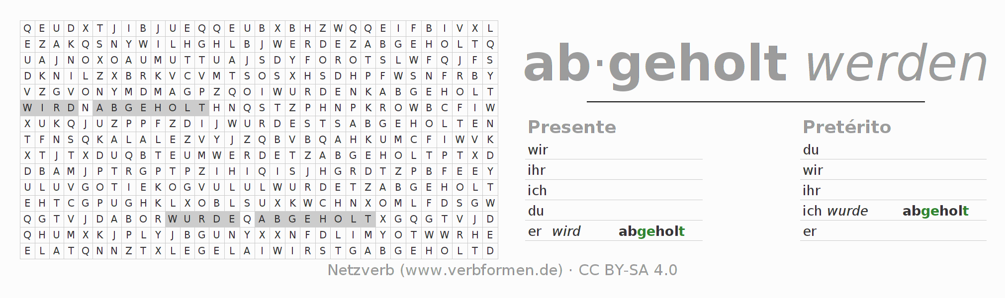 Com o caça-palavras aprende-se de uma forma desafiadora a conjugação do verbo abholen.