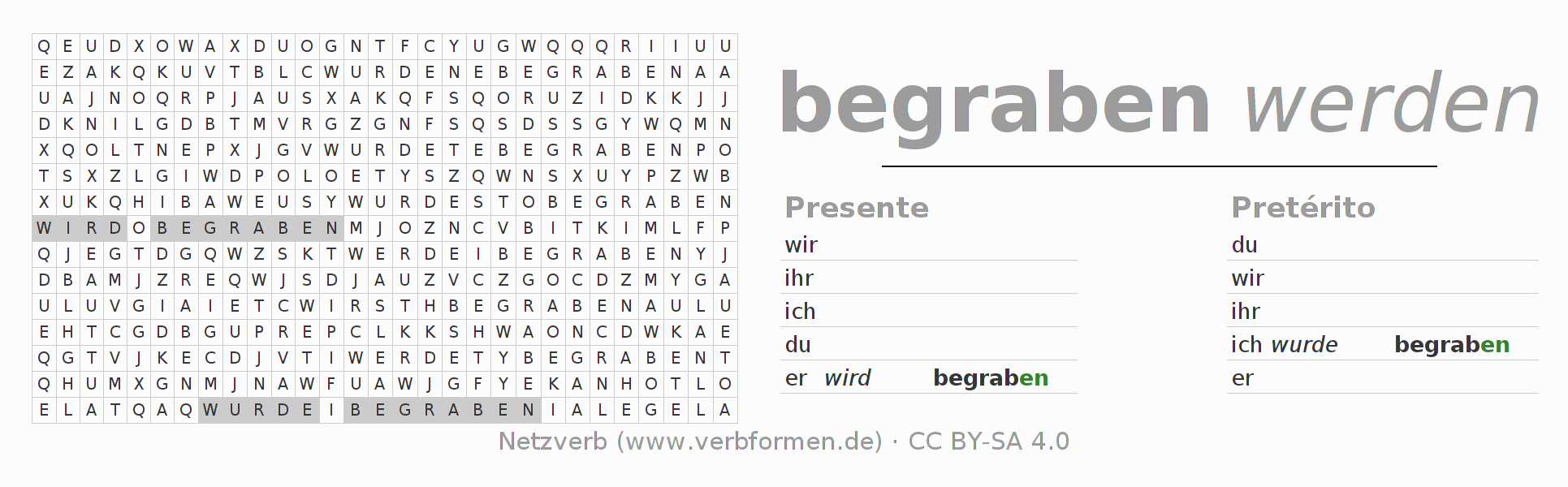 Com o caça-palavras aprende-se de uma forma desafiadora a conjugação do verbo begraben.