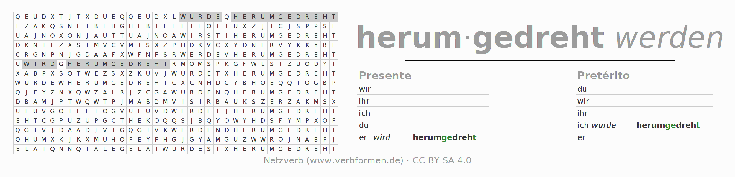 Com o caça-palavras aprende-se de uma forma desafiadora a conjugação do verbo herumdrehen.