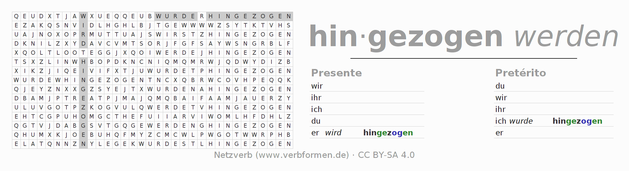 Caça-palavras para todas as formas do verbo hinziehen (hat)