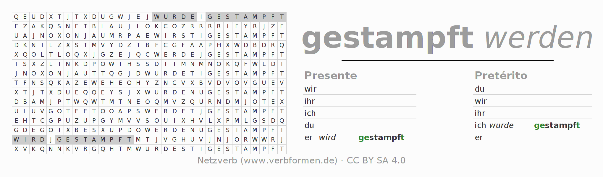 Com o caça-palavras aprende-se de uma forma desafiadora a conjugação do verbo stampfen.
