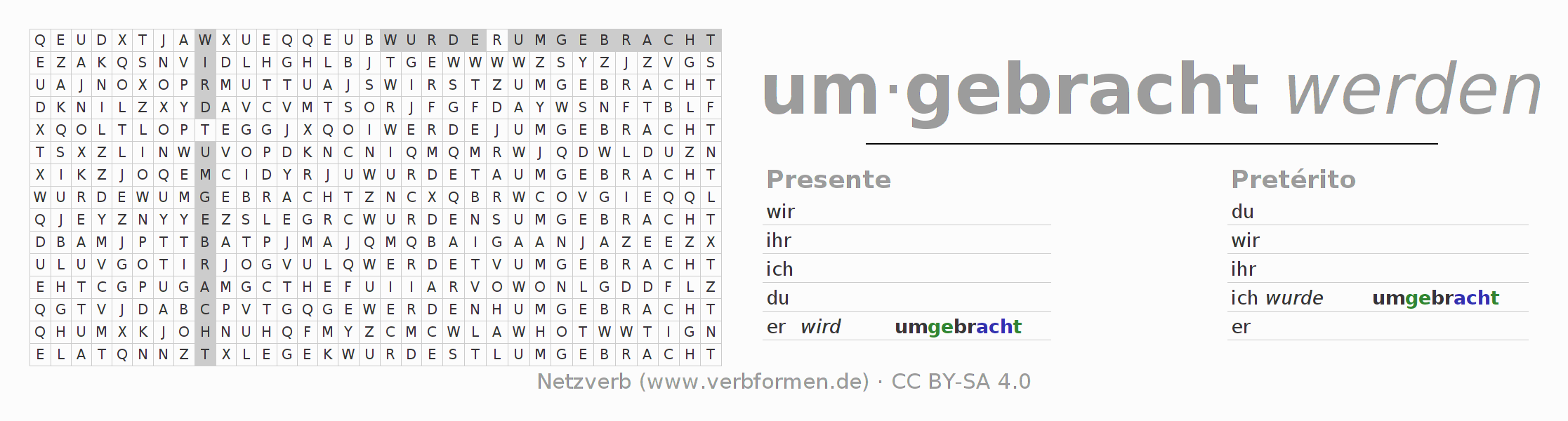 Com o caça-palavras aprende-se de uma forma desafiadora a conjugação do verbo umbringen.
