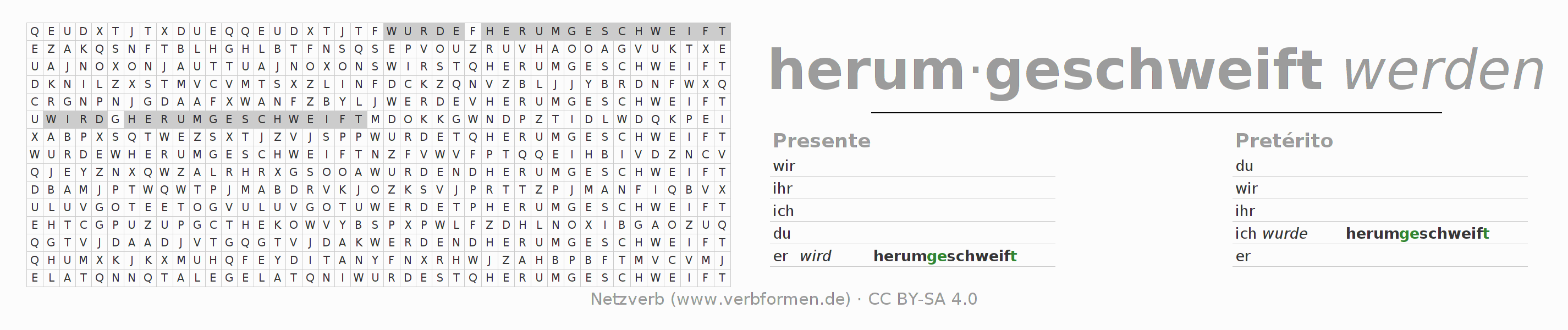 Com o caça-palavras aprende-se de uma forma desafiadora a conjugação do verbo herumschweifen.