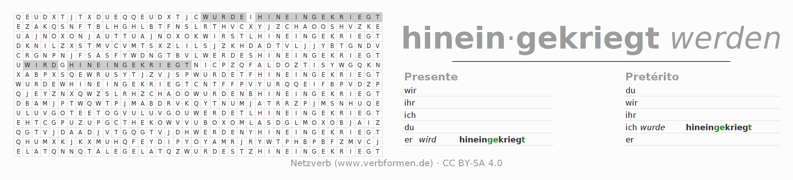 Caça-palavras para todas as formas do verbo hineinkriegen