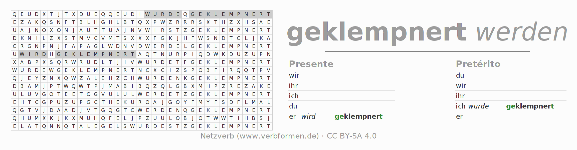 Com o caça-palavras aprende-se de uma forma desafiadora a conjugação do verbo klempnern.
