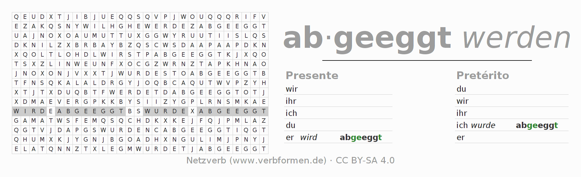 Caça-palavras para todas as formas do verbo abeggen