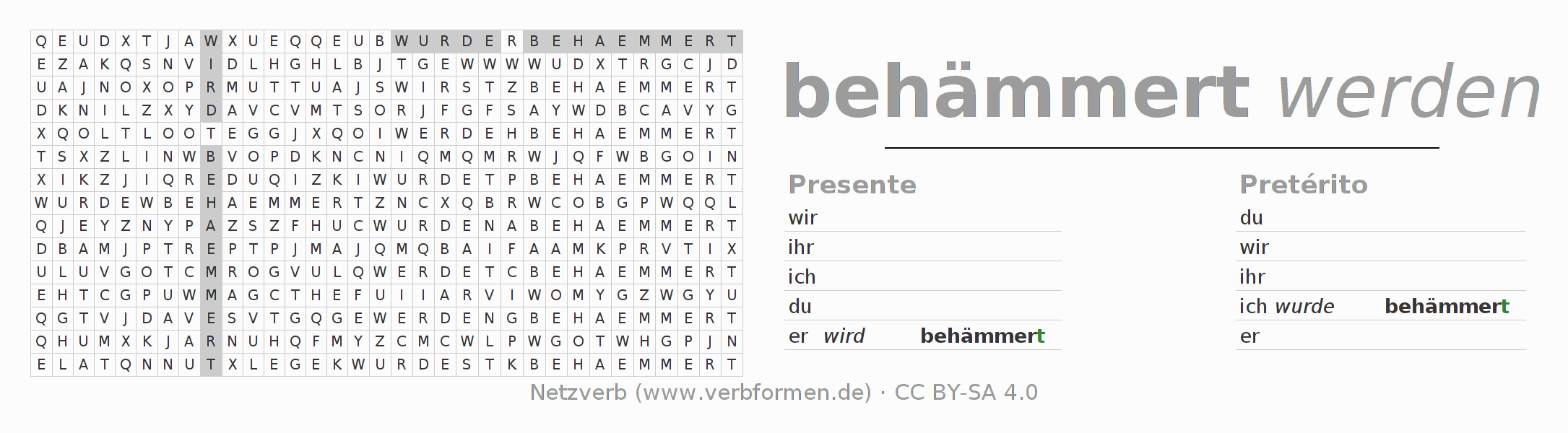 Caça-palavras para todas as formas do verbo behämmern