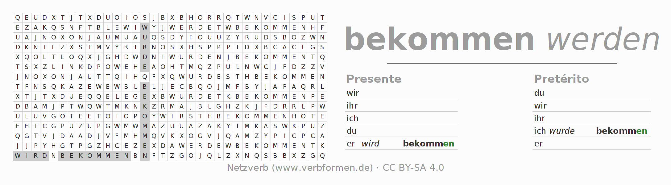 Com o caça-palavras aprende-se de uma forma desafiadora a conjugação do verbo bekommen.