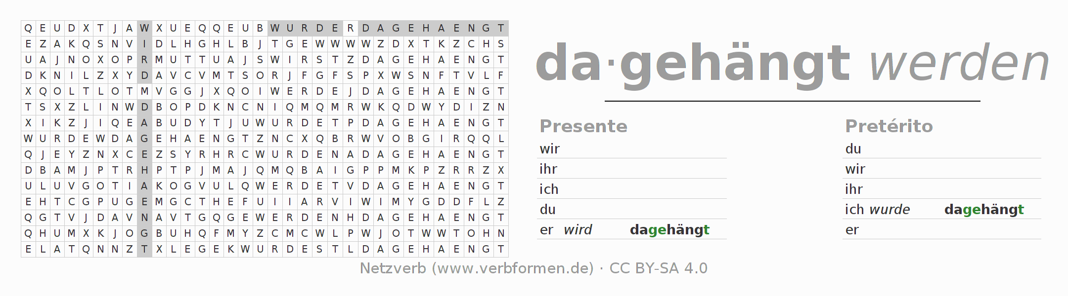 Com o caça-palavras aprende-se de uma forma desafiadora a conjugação do verbo dahängen.
