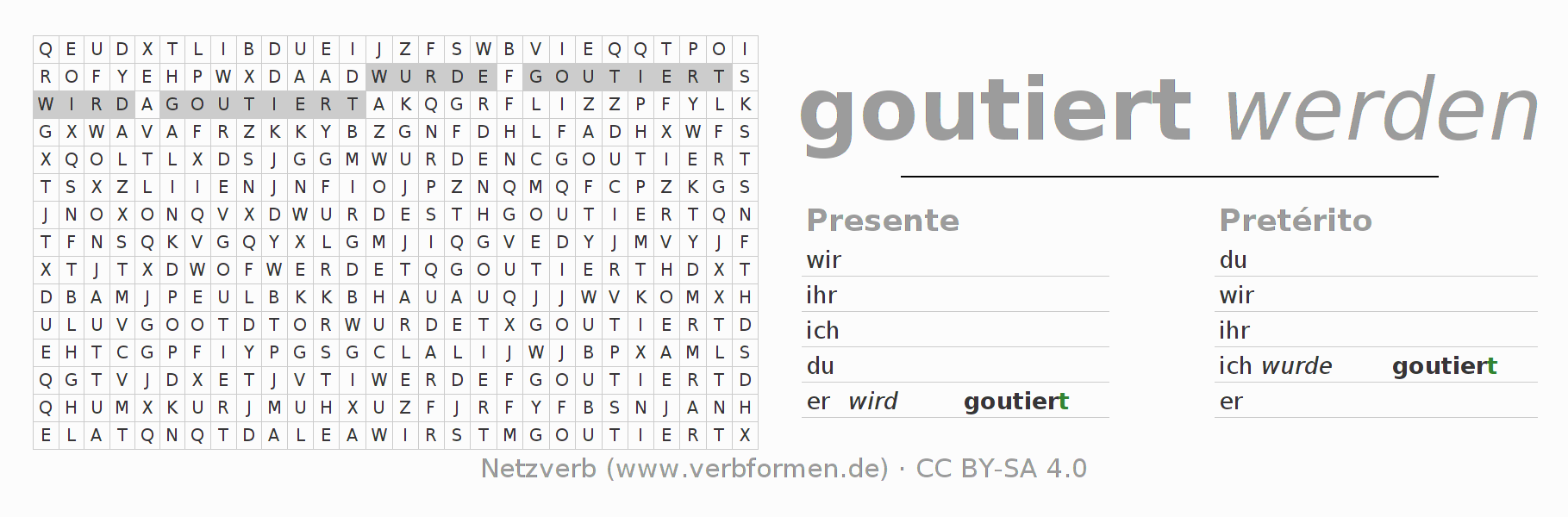 Com o caça-palavras aprende-se de uma forma desafiadora a conjugação do verbo goutieren.