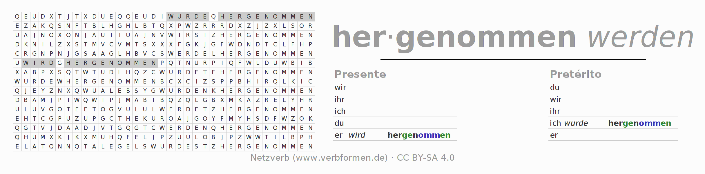 Caça-palavras para todas as formas do verbo hernehmen